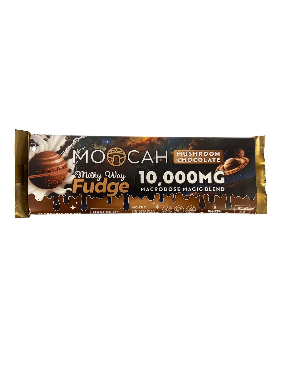 Milky Way Fudge Moocah Macrodose Blend Chocolate Bar 10000MG brings thick fudge notes mixed with a clean blend that stays smooth from the first bite. You get 12 squares for even pacing. It contains no THC, no Amanita, and is gluten free. The taste is deep, soft, and steady, offering a rich feel without being heavy. Each piece melts with ease and keeps the flavor balanced. It is made for users who like fuller chocolate.
